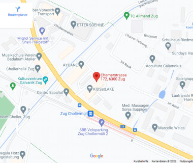 PRAXIS -INFO Vor der Praxis gibt es verschiedene Besucherparkplätze. (PARKING PAY, EASYPARK od. TWINT, ZONE 802) Mit dem öffnetlichen Verkehr erreichen Sie die Praxis bequem mit der Bahn bis Station Chollermüli. Die Praxis ist direkt vis à vis auf dem Gygli Areal Eingang 172. Sie befindet sich im ersten Stock rechts.